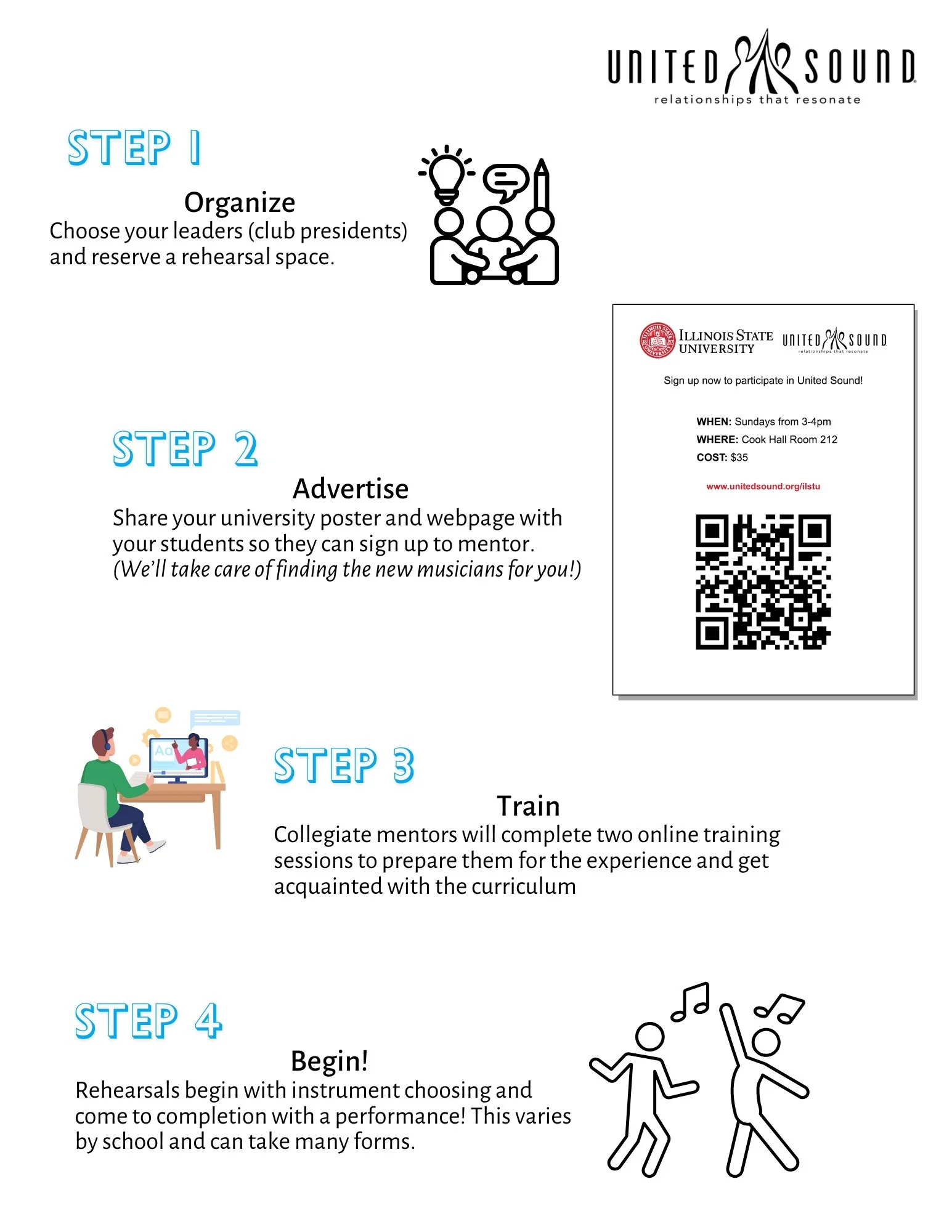 United Sound is intended to be entirely student driven. You’ll choose chapter presidents and we’ll meet with them every month to keep them going! Check out the Chapter Presidents tab in the footer below. Your presidents will design lesson plans, create fun activities, and write modified parts for the New Musicians to play. As a faculty advisor, you primary role are 1) to reserve a rehearsal space, 2) help to advertise the opportunity to all interested parties, 3) coordinate performances with the chapter presidents.