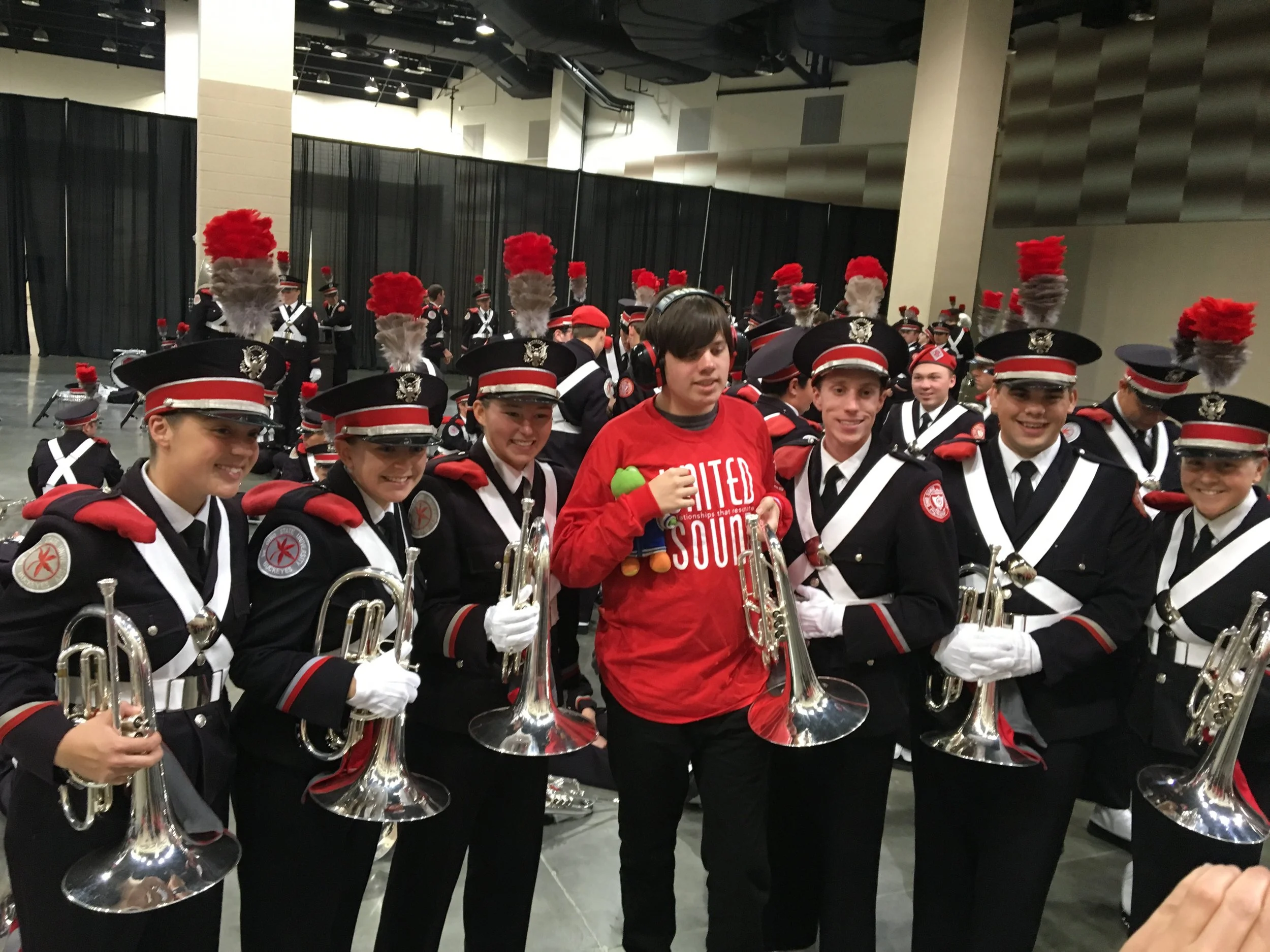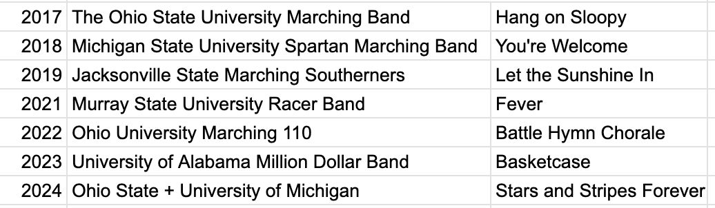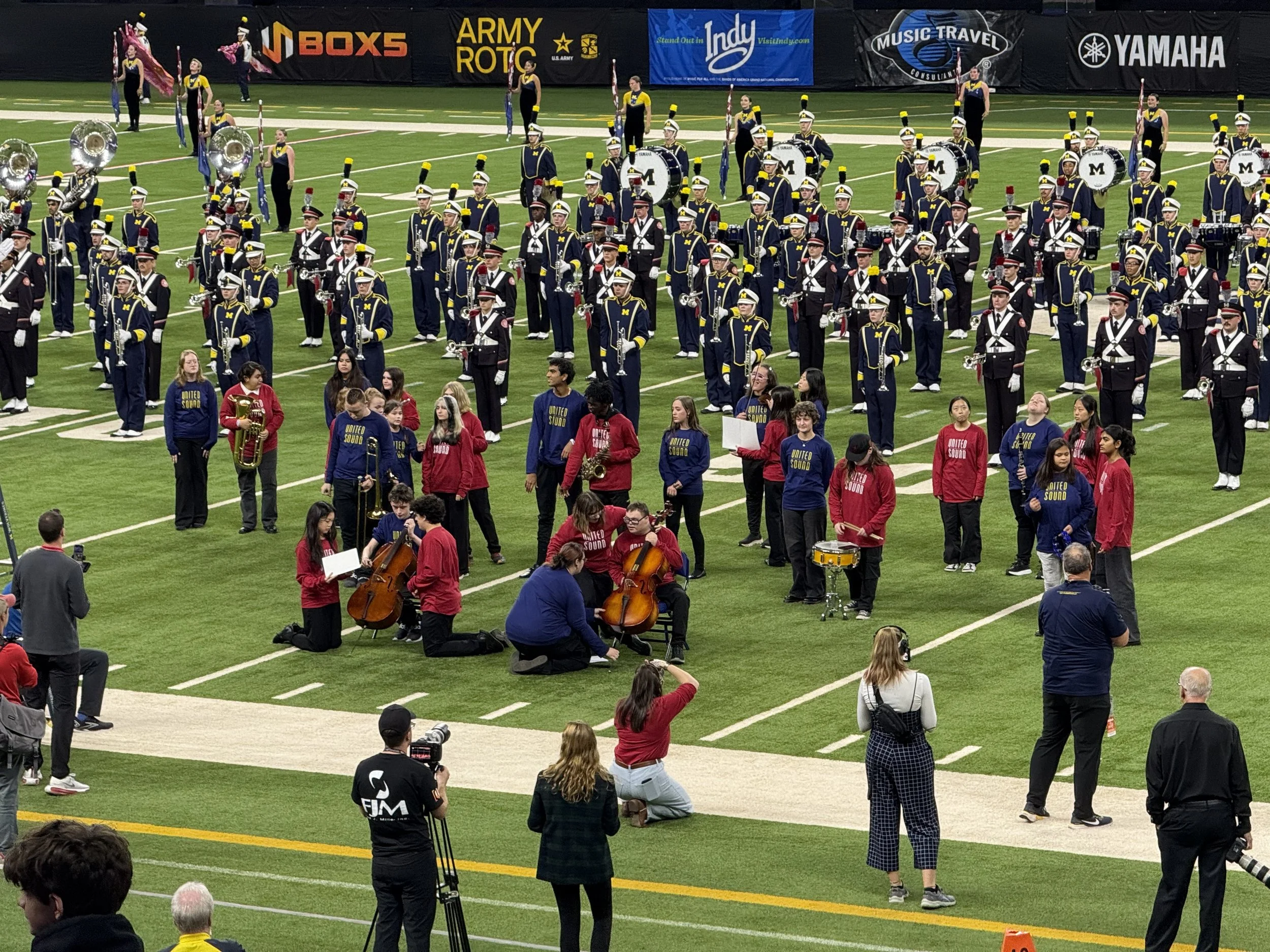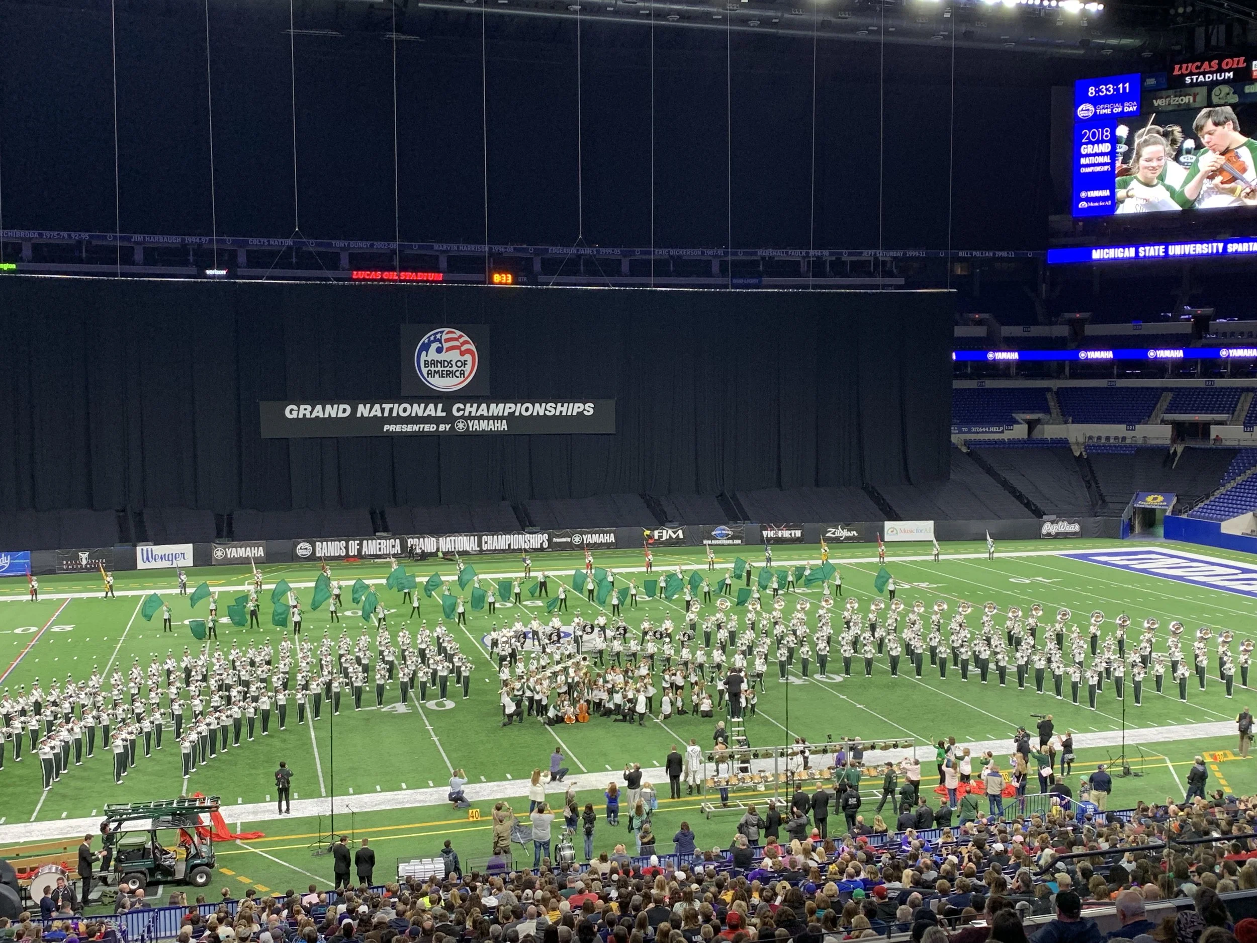 On field, you’ll do your entire show as planned and then add the one more tune with us in a standstill. Some bands plan to arc at the end of their show. Some, we just find a place within the last set. For example, with OSU, Script Ohio was their last song, so our kids ran out to the bottom side of the H. See below.